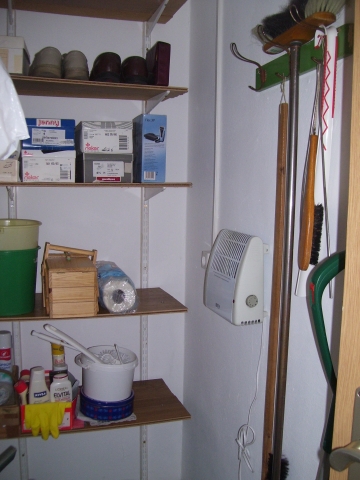 In dieser Abstellkammer neben einem Bad und angrenzend zu zwei Aussenwänden gab es im letztem kalten Winter 2008/2009 Schimmelbildung. Schimmel war nach Angabe des Hausbesitzers schon Jahre zuvor in bedeutend geringerm Maße aufgetreten. Nach herstellen von Folienwänden zum Schutz der Bewohner und der angrenzenden Räume wurden die bestehenden Regale abgebaut und alles soweit wie möglich desinfiziert. Loser Putz entfernt, tiefgründig das Mycel abgetötet und gestrichen.